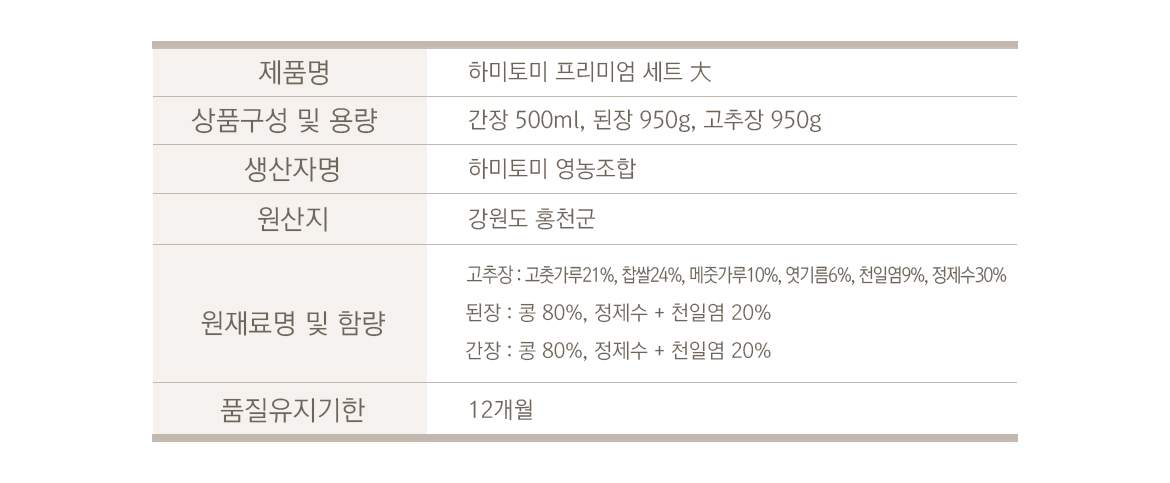 농수산물의 원산지 표시에 관한 법률에 따른 원산지 -고추장:고춧가루21%(유기농·국내산),찹쌀24%(유기농·국내산),메줏가루10%,엿기름6%(유기농·국내산),천일염9%(유기농·국내산),정제수30% -된장/간장:콩80%(유기농·국내산),정제수+천일염20%(유기농·국내산)