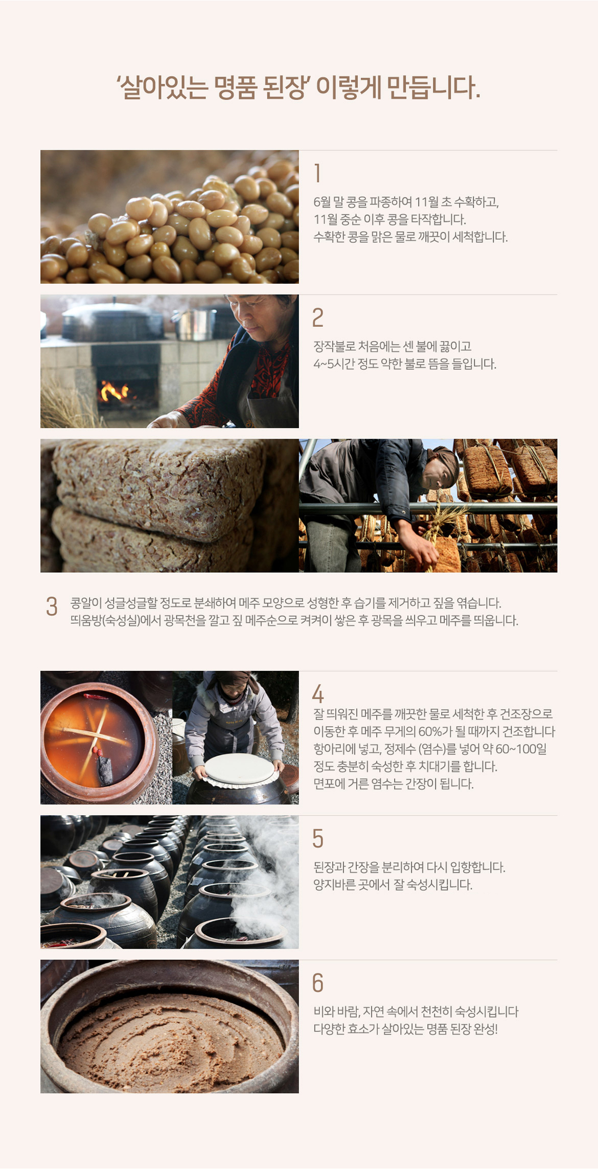 가열 : 가마솥 장작 / 건조 : 자연 건조 60일 / 숙성 : 옹기 / 숙성시간 : 최소 36개월 / 발효방식 : 자연발생균